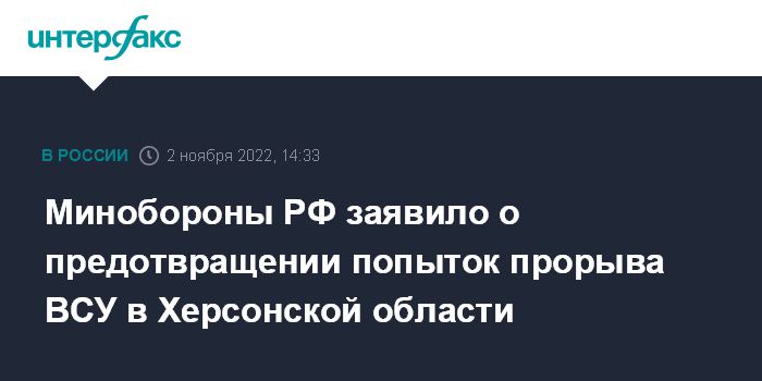 Москва. 2 ноября. INTERFAX.RU - Российские военные заявили о предотвращении попыток прорыва украинских войск в Херсонской области.