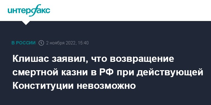 Москва. 2 ноября. INTERFAX.RU - Возвращение смертной казни в России невозможно, заявил глава комитета Совета по конституционному законодательству и госстроительству Андрей Клишас.
