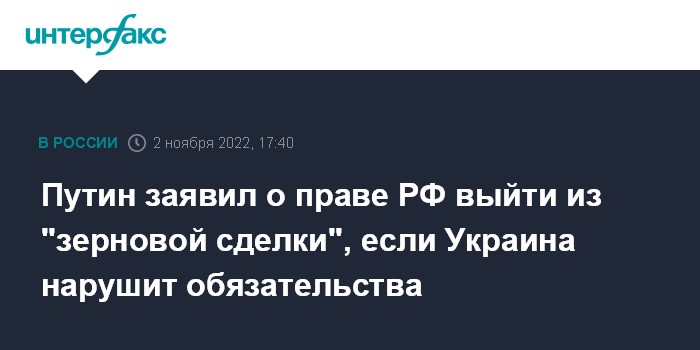 Москва. 2 ноября. INTERFAX.RU - Россия оставляет за собой право выйти из "зерновой сделки" в случае нового нарушения Украиной своих обязательств, заявил президент РФ Владимир Путин.