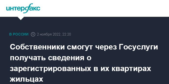 Москва. 2 ноября. INTERFAX.RU - Минцифры совместно с МВД поручено создать на портале Госуслуг сервис, который позволит владельцам жилья запрашивать сведения о лицах, зарегистрированных в их недвижимости.