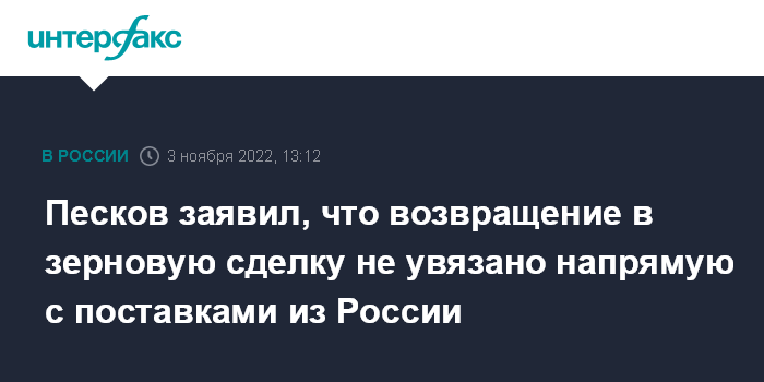 Песков заявил, что возвращение в зерновую сделку не увязано напрямую с поставками из России