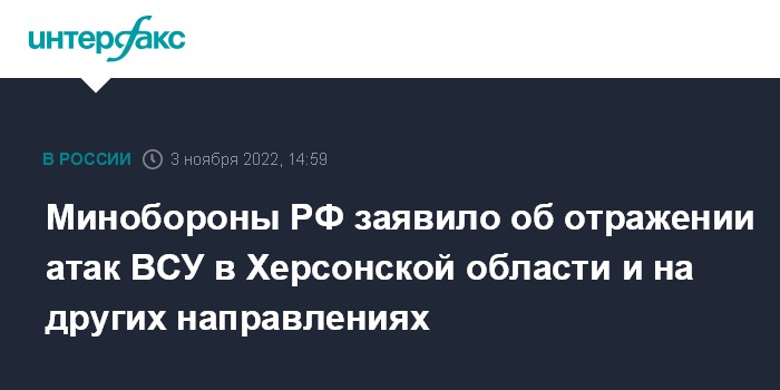 Москва. 3 ноября. INTERFAX.RU - Российские военные отразили атаки Вооруженных сил Украины (ВСУ) в Херсонской области и на ряде других направлений, сообщил официальный представитель министерства обороны РФ Игорь Конашенков на брифинге в четверг.