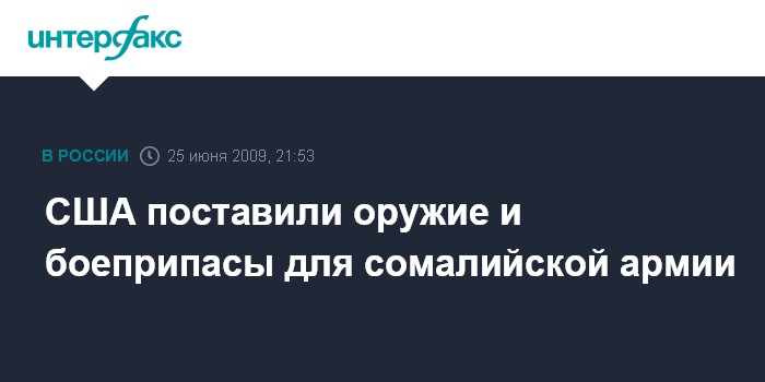 Вашингтон. 25 июня. INTERFAX.RU - США обеспечили армию Сомали вооружением для борьбы с повстанцами, заявил представитель государственного департамента США Иэн Келли.