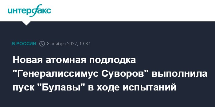 Москва. 3 ноября. INTERFAX.RU - Новая российская стратегическая атомная подводная лодка "Генералиссимус Суворов", которая завершает государственные испытания, выполнила стрельбу ракетой "Булава" из Белого моря по полигону на Камчатке, сообщили в Минобороны РФ.
