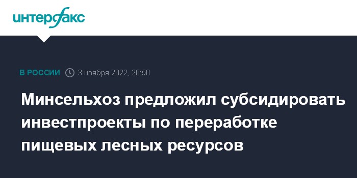 Москва. 3 ноября. INTERFAX.RU - Российский Минсельхоз предложил субсидировать инвестпроекты по переработке пищевых лесных ресурсов. Ведомство опубликовало проект соответствующего постановления правительства на сайте подготовки нормативно-правовых актов.