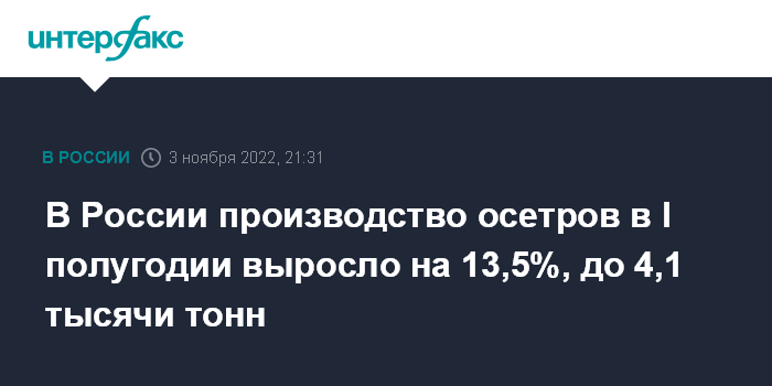 Москва. 3 ноября. INTERFAX.RU - Российские предприятия аквакультуры в I полугодии 2022 года произвели 4,1 тысячи тонн осетровых видов рыбы, что на 13,5% больше, чем за годом ранее, сообщило Росрыболовство.