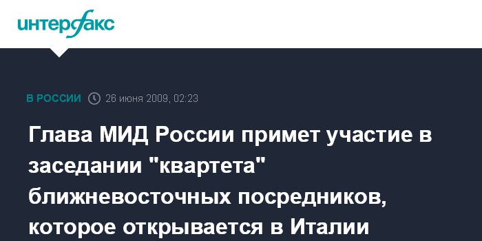 Москва. 26 июня. ИНТЕРФАКС - Глава МИД РФ Сергей Лавров в пятницу примет участие в заседании ближневосточного "квартета" международных посредников в итальянском Триесте.