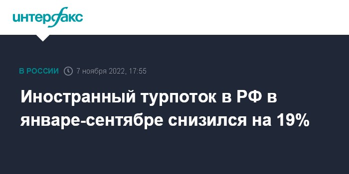 Общее число поездок иностранцев в Россию выросло на 16% - с 8,7 млн в январе-сентябре 2021 года до 10,2 млн за три квартала 2022 года. По сравнению с аналогичным периодом 2019 года въездной турпоток отстает в 2,5 раза.