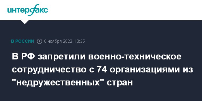 Москва. 8 ноября. INTERFAX.RU - Российское правительство в качестве ответных санкций запретило сделки в области военно-технического сотрудничества (ВТС) с 74 организациями из "недружественных" стран, сообщается на сайте правительства РФ.