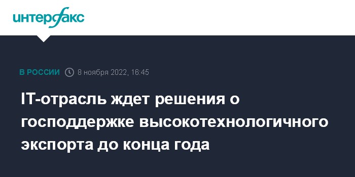 Москва. 8 ноября. INTERFAX.RU - Российская IT-отрасль рассчитывает, что правительство до конца 2022 года примет решение о поддержке высокотехнологичного экспорта, заявил "Интерфаксу" президент ассоциации разработчиков программного обеспечения "Руссофт" Валентин Макаров.