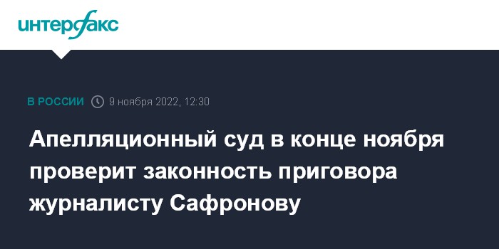 Москва. 9 ноября. INTERFAX.RU - Первый апелляционный суд общей юрисдикции 30 ноября рассмотрит апелляционную жалобу на приговор журналисту Ивану Сафронову, осужденному на 22 года колонии за госизмену, сообщили "Интерфаксу" в суде в среду.