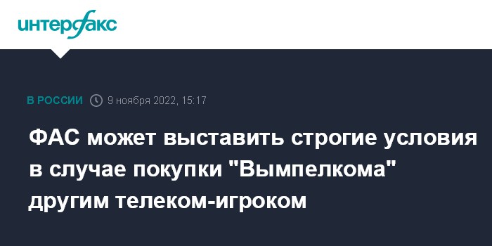 Москва. 9 ноября. INTERFAX.RU - Федеральная антимонопольная служба (ФАС) России не исключает выдачи предписания о соблюдении строгих поведенческих условий при одобрении ходатайства о покупке ПАО "Вымпелком", если претендентом на покупку будет выступать один из других игроков российского телеком-рынка, заявил глава ФАС Максим Шаскольский журналистам.