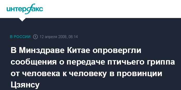 По его словам, в последнее время некоторые китайские и зарубежные СМИ, в том числе и медицинские, сообщили о том, что в Китае зафиксирован случай передачи птичьего гриппа от человека к человеку. Это послужило причиной того, что министерство вынуждено было повторить ранее сделанные заявления о том, что распространяемые сведения не соответствуют действительности.