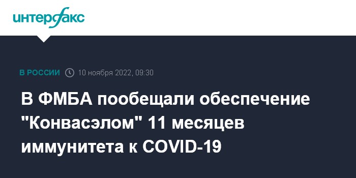 Москва. 10 ноября. INTERFAX.RU - Разработанная Федеральным медико-биологическим агентством (ФМБА) вакцина от COVID-19 "Конвасэл", согласно наблюдениям, обеспечивает иммунитет в течение 11 месяцев, сообщается на сайте препарата.