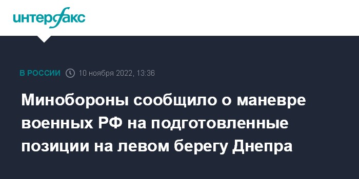 Москва. 10 ноября. INTERFAX.RU - Российская группировка войск осуществляет маневр подразделений на подготовленные позиции на левом берегу реки Днепр, сообщил официальный представитель министерства обороны РФ Игорь Конашенков на брифинге в четверг.