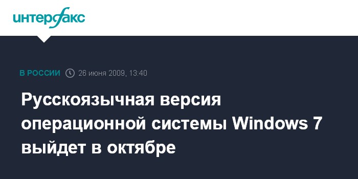 Москва. 26 июня. INTERFAX.RU - Русскоязычная версия новой операционной системы (ОС) Windows 7 (следующей после Windows Vista) появится на российском рынке 22 октября 2009 года, говорится в сообщении Microsoft. Локализованная версия поступит на рынок одновременно с мировым выпуском.