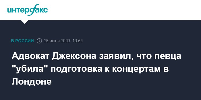 Москва. 26 июня. INTERFAX.RU - Адвокат семьи Джексонов Брайан Оксман заявил в пятницу, что смерть Майкла Джексона стала следствием давления, которое оказывало на певца обязательство выступить в июле на многомиллионной концертной площадке "О2" в Лондоне, пишет британская газета "Ивнинг стандард". По словам адвоката, в гибели Джексона виноваты "посредники", вынудившие певца переносить чрезмерные физические нагрузки в рамках подготовки к юбилейному концерту. "Случилось то, чего я всегда боялся и о чем предупреждал", - сказал Оксман.