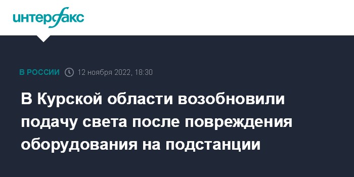 Москва. 12 ноября. INTERFAX.RU - Губернатор Курской области Роман Старовойт сообщил в субботу в своем телеграм-канале о восстановлении электроснабжения, нарушенного в результате сброса на подстанцию взрывного устройства.