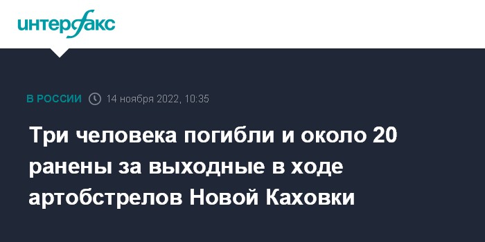 Москва. 14 ноября. INTERFAX.RU - Новая Каховка на левом берегу Днепра в Херсонской области стала целью артиллерийских обстрелов ВСУ, за последние двое суток погибли три человека и около 20 ранены, сообщил журналистам глава администрации Новокаховского городского округа Владимир Леонтьев.