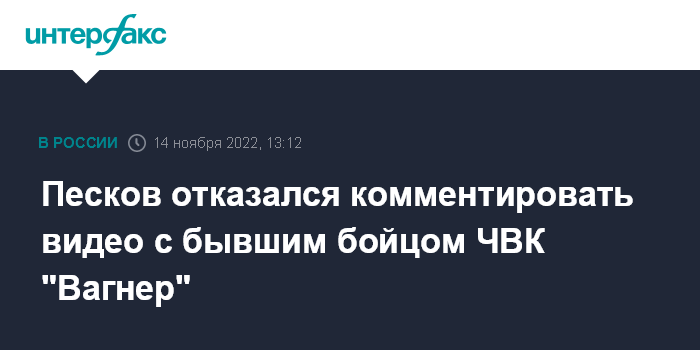 Москва. 14 ноября. INTERFAX.RU - В Кремле не комментируют появившееся в интернете видео с якобы убийством сдавшегося в плен "вагнеровца" и последующий комментарий бизнесмена Евгения Пригожина, так как не знают, насколько вся эта ситуация соответствует действительности, заявил пресс-секретарь президента Дмитрий Песков.