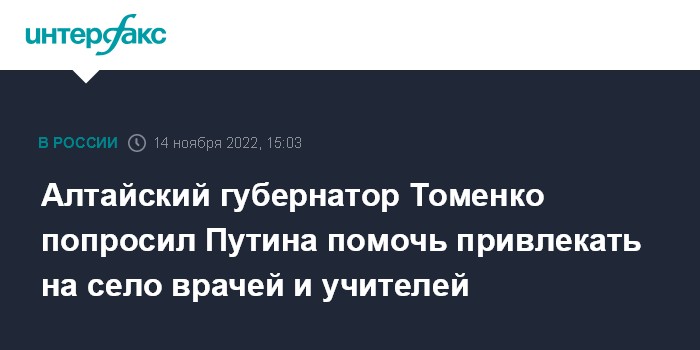 Москва. 14 ноября. INTERFAX.RU - Губернатор Алтайского края Виктор Томенко на встрече с президентом Владимиром Путиным попросил включить строительство жилья в сельских районах, предназначенного для врачей и учителей, в федеральную адресную инвестиционную программу.