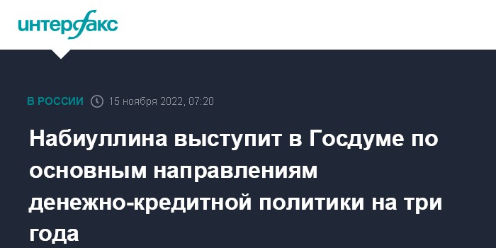Москва. 15 ноября. INTERFAX.RU - Госдума на заседании во вторник рассмотрит "Основные направления единой денежно-кредитной политики на 2023-2025 годы", с докладом перед депутатами выступит глава ЦБ Эльвира Набиуллина.