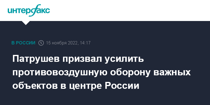 Москва. 15 ноября. INTERFAX.RU - Секретарь Совета безопасности России Николай Патрушев заявил, что средствами противовоздушной обороны (ПВО) и контрбатарейной борьбы необходимо усилить защиту критически важных объектов в центре России.