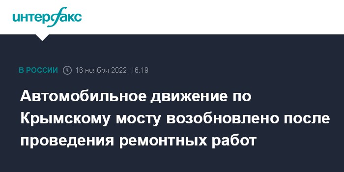 Москва. 16 ноября. INTERFAX.RU - Приостановленное на полдня из-за проведения ремонтных работ движение по Крымскому мосту открыли в среду, сообщает Минтранс РФ.