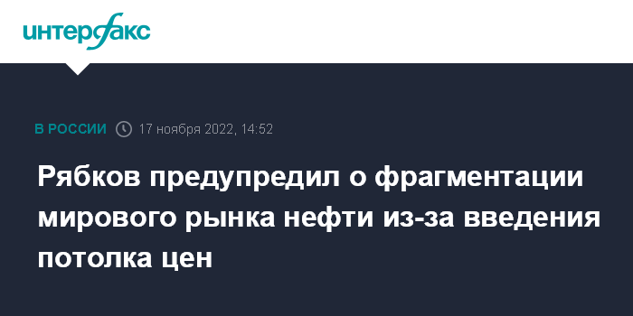 Москва. 17 ноября. INTERFAX.RU - Попытки ввести потолок цен на российскую нефть приведут к фрагментации рынка, Россия будет к этому адаптироваться, заявил RTVI замглавы МИД Сергей Рябков.