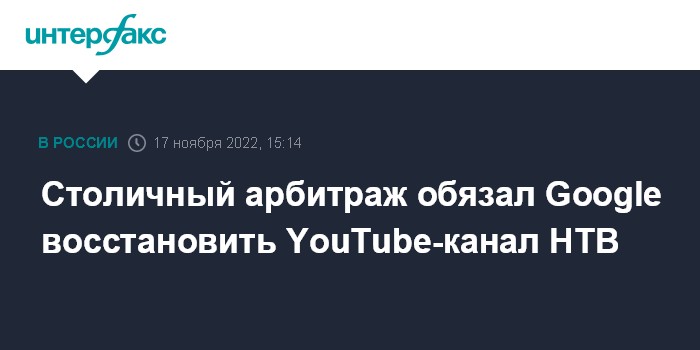 Москва. 17 ноября. INTERFAX.RU - "Газпром-медиа холдинг" (ГПМ) сообщил, что Арбитражный суд Москвы удовлетворил иск телеканала НТВ к компании Google и обязал ее восстановить YouTube-канал телекомпании.