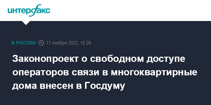 Москва. 17 ноября. INTERFAX.RU - Группа депутатов и сенаторов внесла в Госдуму законопроект о недискриминационном доступе операторов связи в многоквартирные жилые дома.