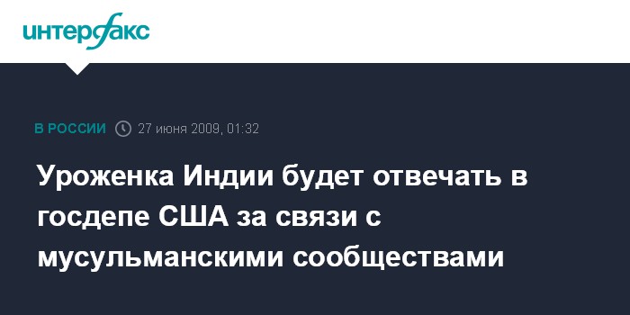 Вашингтон. 27 июня. ИНТЕРФАКС - Фара Пандит назначена руководителем отдела специального представителя США в мусульманских сообществах, говорится в сообщении госдепартамента США.