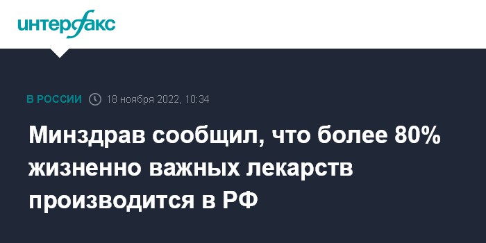 Москва. 18 ноября. INTERFAX.RU - Более 80% лекарственных препаратов из перечня жизненно важных производится внутри страны; также более 30% медицинских изделий - российского производства, сообщил замминистра здравоохранения РФ Евгений Камкин.