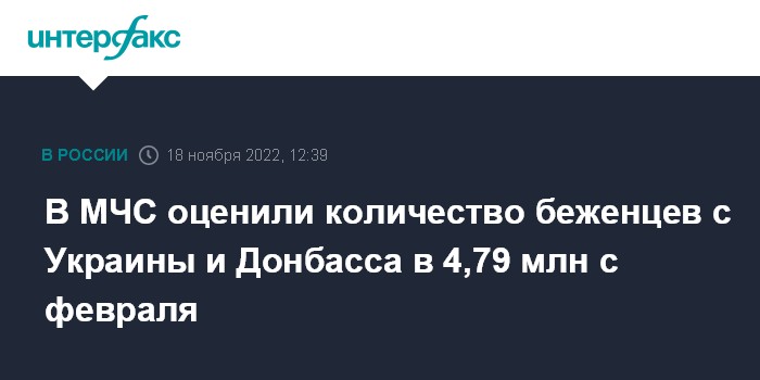 Москва. 18 ноября. INTERFAX.RU - В Россию с февраля прибыли более 4,79 млн беженцев с Украины и из Донбасса, в том числе более 712 тысяч детей, сообщил замглавы МЧС России Анатолий Супруновский на Всероссийском координационном совете уполномоченных по правам человека.