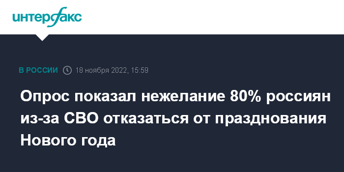 Москва. 18 ноября. INTERFAX.RU - Подавляющее большинство россиян (81%) считают, что в условиях продолжающейся военной операции РФ на Украине не следует отказываться от новогодних праздничных мероприятий, свидетельствуют данные опроса ВЦИОМ.