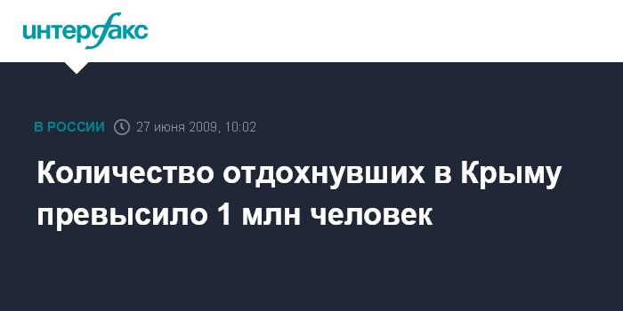 Как сообщили в субботу агентству "Интерфакс-Украина" в пресс-службе Министерства курортов и туризма Крыма, по данным на 26 июня, количество отдохнувших в автономии, рассчитанное по методике Национальной академии природоохранного и курортного строительства, составило 1019,9 тыс. человек, что на 16,7% меньше уровня прошлого года (В 2008 г. - 1224,6 тыс. чел.).