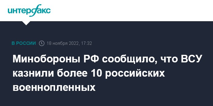 Москва. 18 ноября. INTERFAX.RU - Министерство обороны РФ сообщило, что армия Украины казнила более 10 российских военнослужащих.