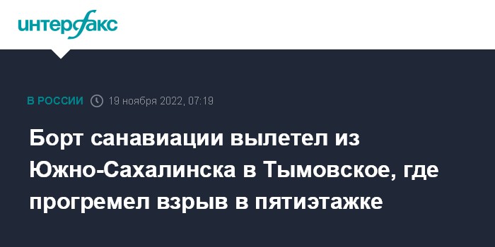 Борт санавиации вылетел из Южно-Сахалинска в Тымовское, где прогремел взрыв в пятиэтажке