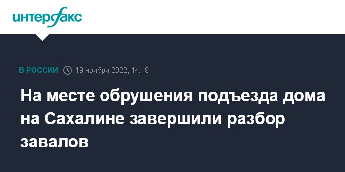 Москва. 19 ноября. INTERFAX.RU - Спасатели завершили работы по разбору завалов на месте обрушения подъезда пятиэтажки на Сахалине, сообщила пресс-служба МЧС России в субботу.