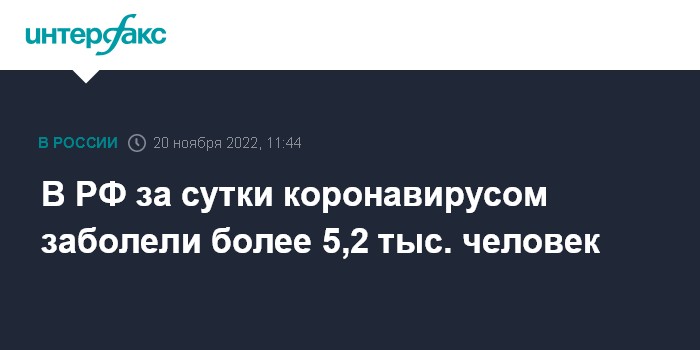 Москва. 20 ноября. INTERFAX.RU - Суточный прирост новых заболевших коронавирусной инфекцией в РФ составил 5 217 случаев, следует из данных оперативного штаба, обнародованных в воскресенье.