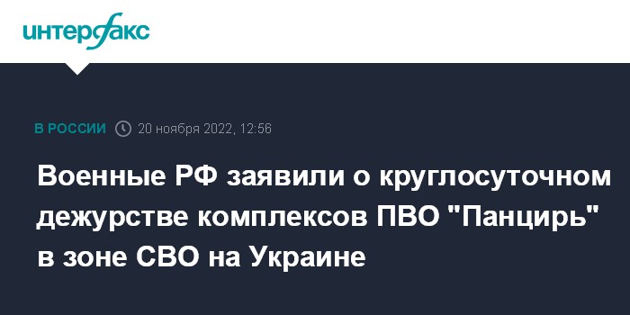 Москва. 20 ноября. INTERFAX.RU - Министерство обороны России сообщило, что расчеты зенитных ракетно-пушечных комплексов "Панцирь-С1" несут круглосуточное боевое дежурство в зоне специальной военной операции, уничтожают украинские ракеты и беспилотники.