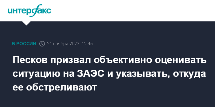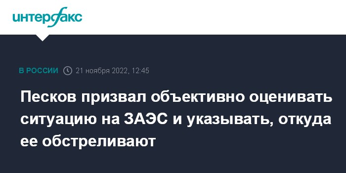 Москва. 21 ноября. INTERFAX.RU - В Кремле обеспокоены ситуацией вокруг Запорожской АЭС, призывают не просто фиксировать обстрелы, а указывать, что они ведутся со стороны украинских вооруженных сил.