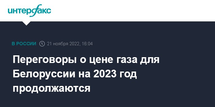 Москва. 21 ноября. INTERFAX.RU - Белоруссия и Россия продолжают переговоры о цене поставок газа для Белоруссии в 2023 году, сообщил "БелТА" белорусский министр энергетики Виктор Каранкевич.