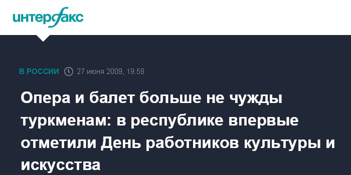 Ашхабад. 27 июня. ИНТЕРФАКС - В субботу в Туркмении был впервые отмечен День работников культуры и искусства, включенный в национальный календарь памятных дат по инициативе президента Гурбангулы Бердымухамедова.