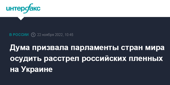 Москва. 22 ноября. INTERFAX.RU - Госдума на заседании во вторник приняла заявление в связи с расстрелом украинскими военными российских военнопленных.