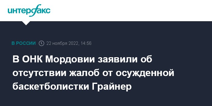 В ОНК Мордовии заявили об отсутствии жалоб от осужденной баскетболистки Грайнер