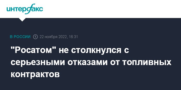 Москва. 22 ноября. INTERFAX.RU - Госкорпорация "Росатом" не столкнулась ни с какими серьезными отказами от ее топлива за рубежом, сообщил журналистам первый замглавы компании Кирилл Комаров.