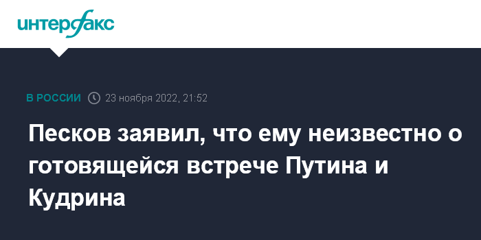 Москва. 23 ноября. INTERFAX.RU - Пресс-секретарь президента РФ Дмитрий Песков заявил, что не располагает информацией о якобы предстоящей в ближайшее время встрече главы Счетной палаты Алексея Кудрина с президентом РФ Владимиром Путиным, на которой предполагается финально обсудить судьбу "Яндекса".