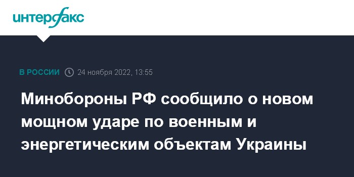 Москва. 24 ноября. INTERFAX.RU - Российские военные в среду нанесли очередной массированный удар оружием большой дальности по военным и энергетическим объектам Украины, заявил официальный представитель Минобороны РФ Игорь Конашенков.