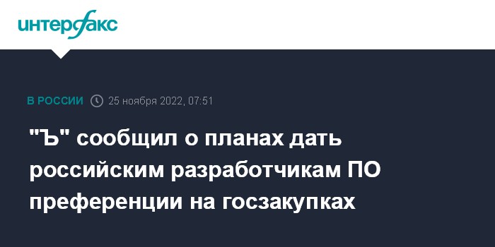 Москва. 25 ноября. INTERFAX.RU - Минцифры РФ готовит новые механизмы поддержки разработчиков программного обеспечения (ПО), включающие, помимо финансовых мер, преференции на рынке госзакупок, пишет газета "Коммерсантъ" со ссылкой на источники на IT-рынке.